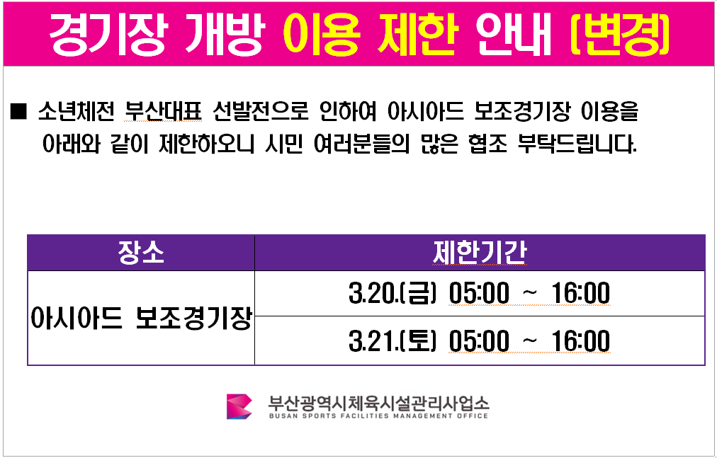 [★변경] 아시아드 보조경기장 이용제한 안내(3월)