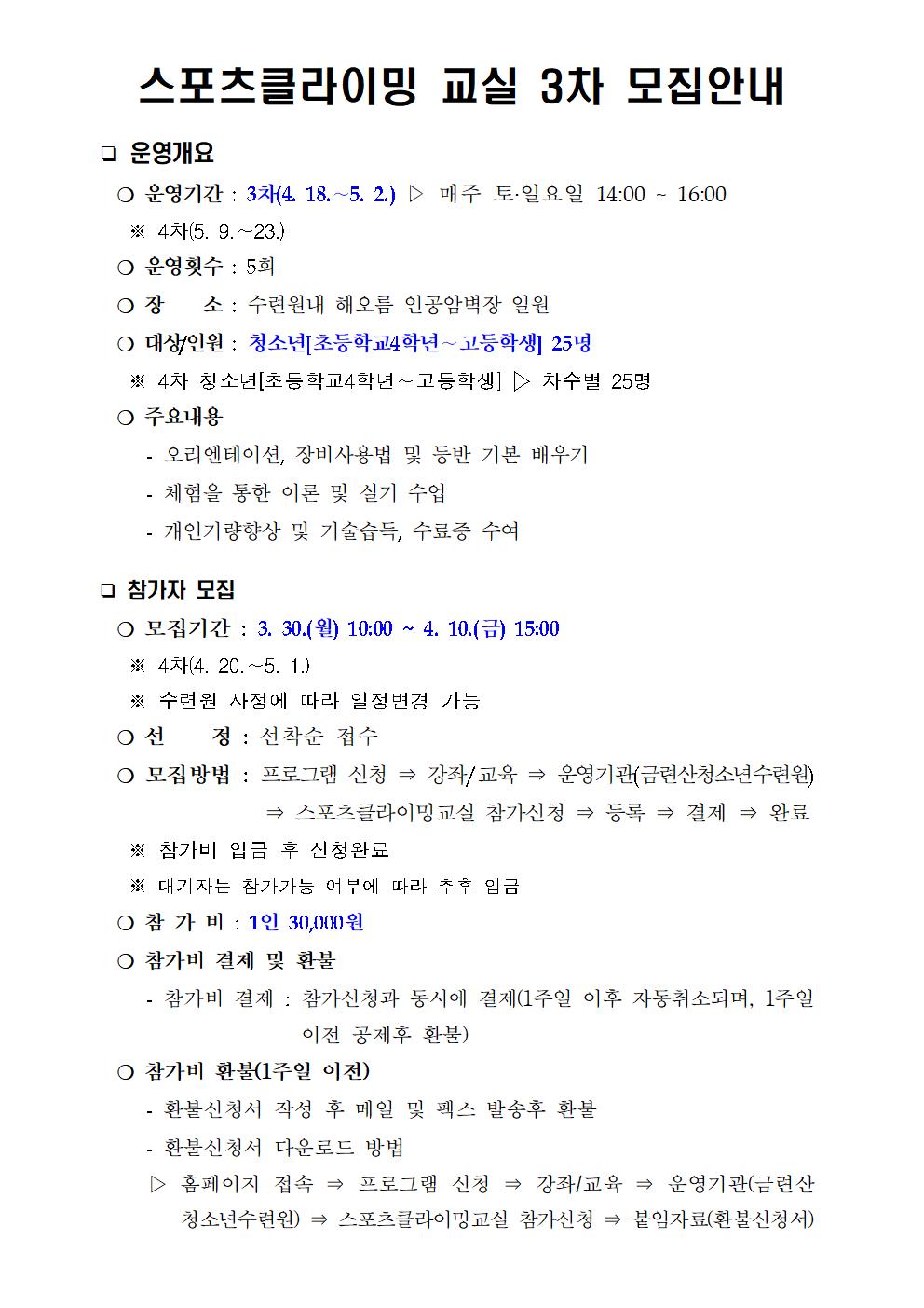 스포츠클라이밍교실(3차) 청소년 모집안내