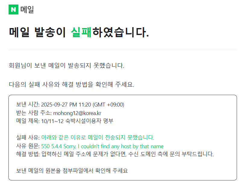 숙박자 명단 송부하려고 하는데, 메일이 안 보내집니다 ㅠ